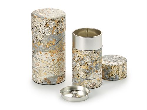 Jolie boîte à thé en métal à double couvercle pour une meilleure conservation de votre thé. Elle est décorée de fleurs de cerisier dorées et blanches en papier washi traditionnel japonais.