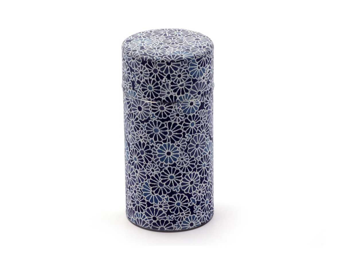 Jolie boîte à thé en métal à double couvercle pour une meilleure conservation de votre thé. Elle est décorée de fleurs bleues en papier washi traditionnel japonais.