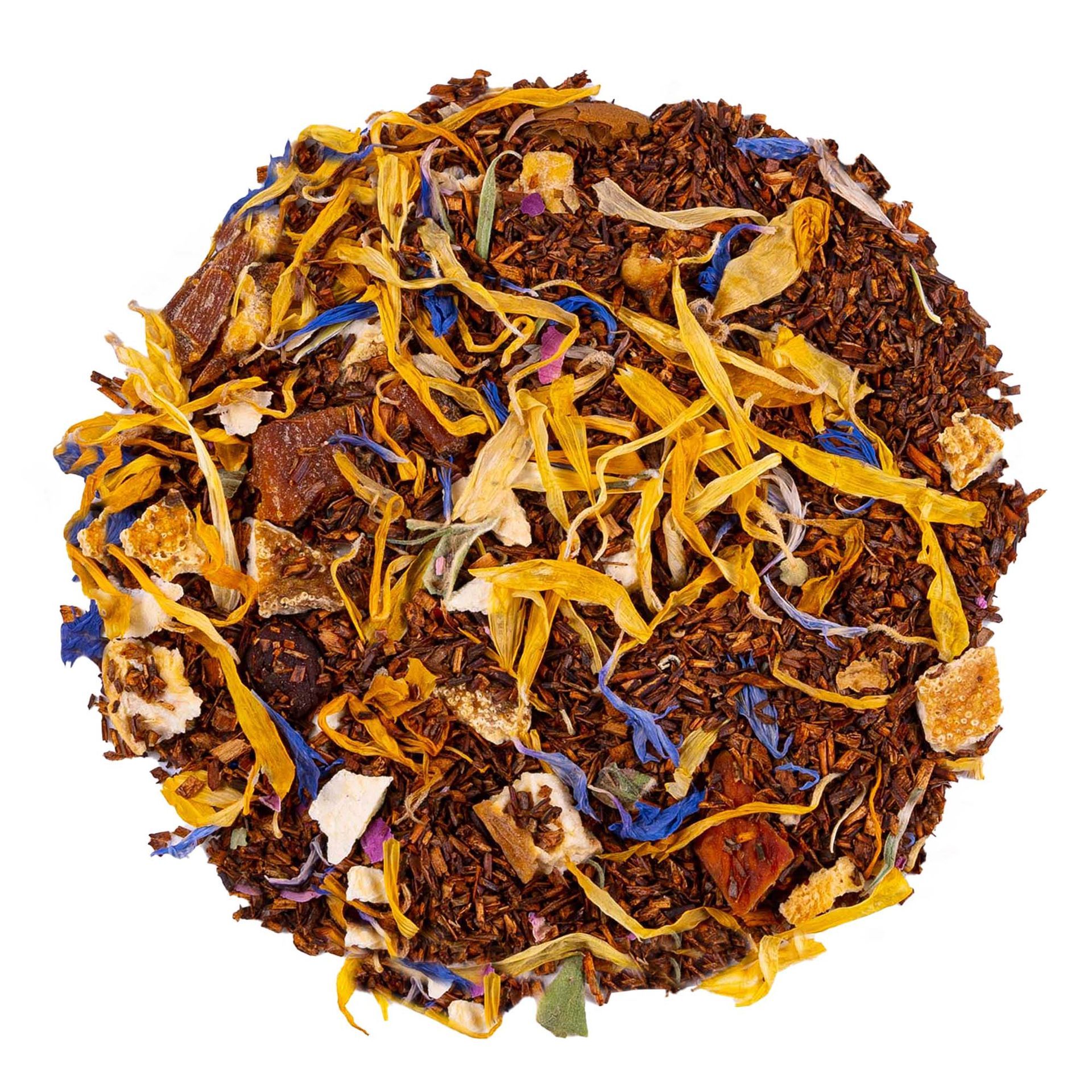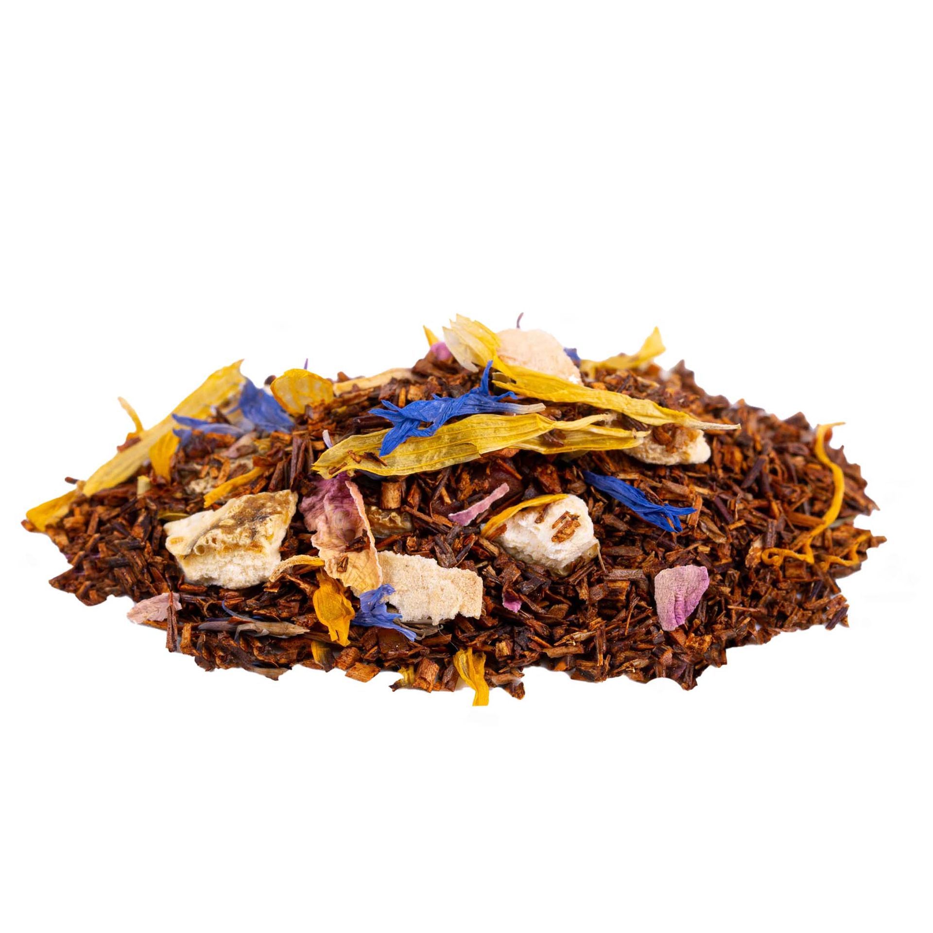 Rooibos naturel*, écorces d'orange*, arôme naturel de mangue, banane (banane, huile de noix de coco, sucre de canne, miel)*, papaye*, morceaux de mangue*, fleurs de souci*, extrait de vanille*, pétales de rose*, abricot*, fleurs de bleuet*.