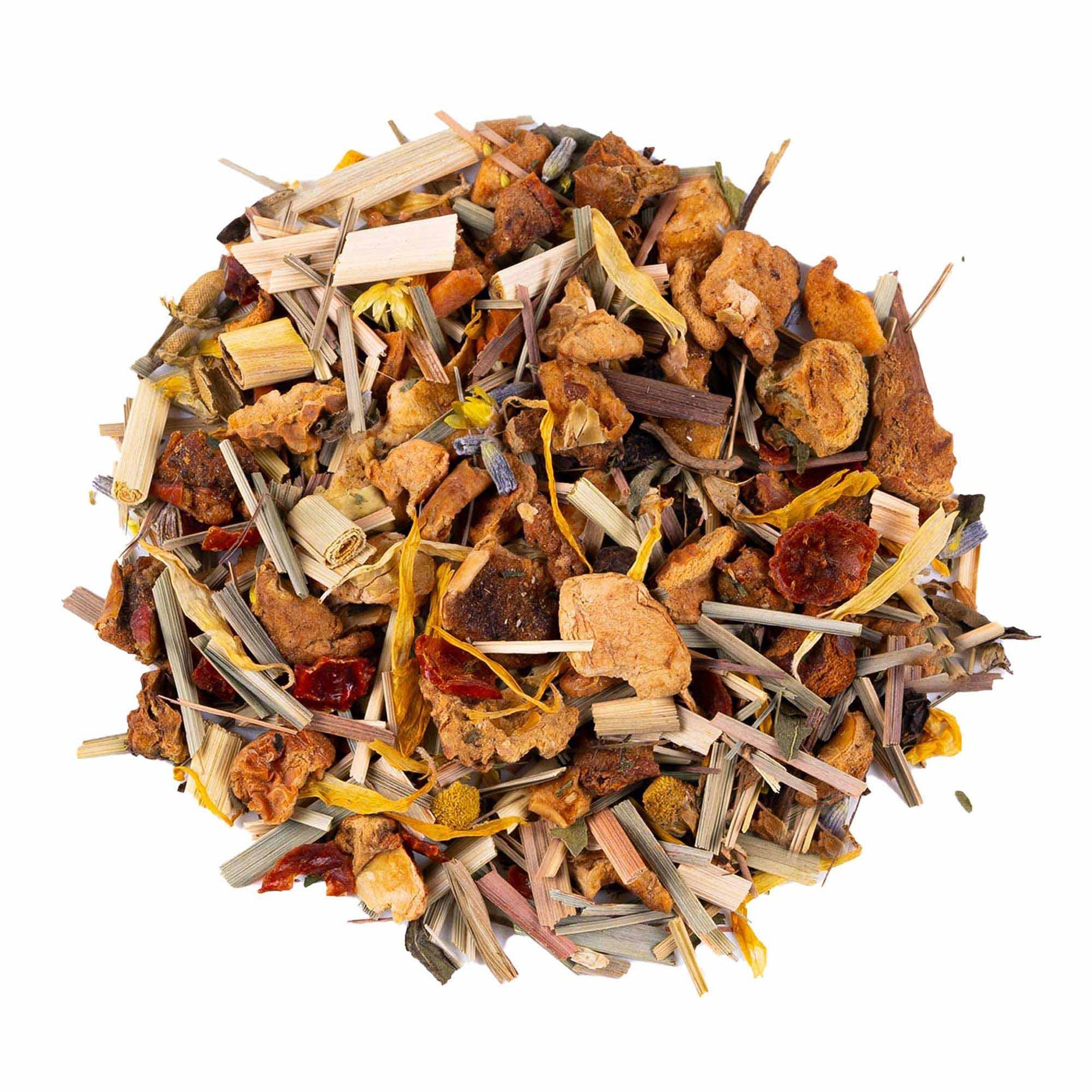 Pomme*, citronnelle*, cynorrhodon*, camomille*, Tulsi*, poivre noir*, menthe poivrée*, lavande*, Stevia*, fleurs de souci*, fleurs d'immortelle*, cardamome*, valériane*.